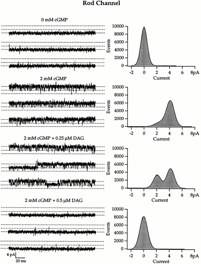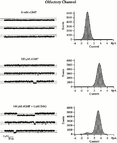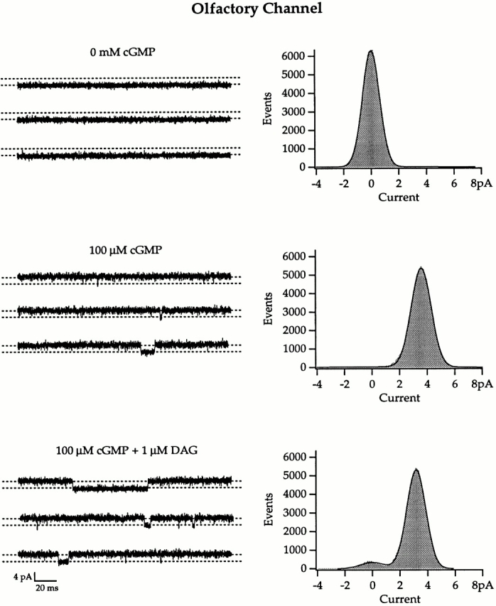 Figure 5. DAG affects Po rather than single-channel conductance of the mouse olfactory channel. Currents were recorded and data are presented in the same manner as in Fig. 4; the patch contains a single olfactory channel. Partial records are shown from three traces of 1 s in length. Amplitude histograms from full records (3 s) are shown. The histograms were fit with Gaussians, indicating a mean single-channel current of 3.2 pA at +80 mV, with and without DAG. |