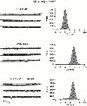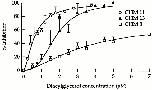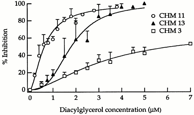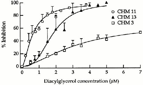 Figure 7. Examples of chimera channel behavior in response to DAG. This figure shows the amount of channel inhibition as a function of increasing DAG concentration for three chimeric constructs (structures depicted in Fig. 8). Points are mean values, plotted with SD (error bars). CHM 11: INmax = 100%, IC50 = 0.63 μM, and n = 1.6 (five patches). CHM 13: INmax = 100%, IC50 = 1.80 μM, and n = 2.8; (six patches). CHM 3: INmax = 68%, IC50 = 3.30 μM, and n = 1.6; 4 patches. |