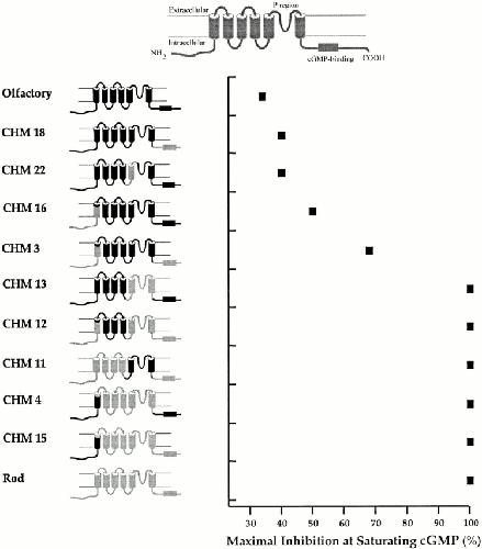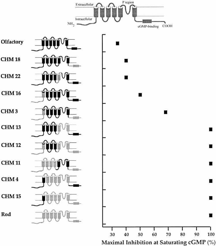 Figure 9. Maximal inhibition by DAG is greatest for chimeras whose transmembrane segments and loops are mostly of the rod channel type. Values for maximal inhibition were obtained from fits to the Hill equation while determining the IC50 values for Fig. 8. |
