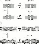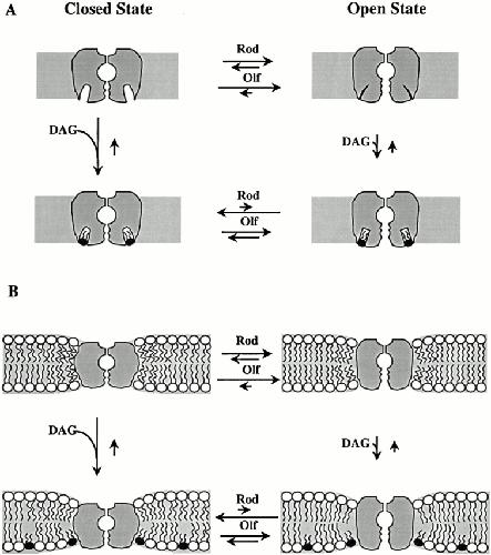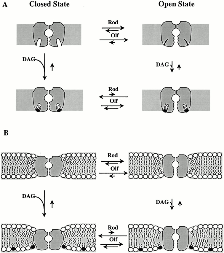 Figure 10. Cartoons depicting two possible mechanisms for the action of DAG. The actual mechanism may lie somewhere between these two extremes. Multiple DAG molecules stabilize the closed state(s) of both rod and olfactory channels, although to different extents. Channels in this diagram are assumed to be fully liganded with cGMP. (See Discussion for further information.) (A) Direct interaction of DAG with the channels. DAG is hypothesized to bind in hydrophobic crevices in closed channels, thereby allosterically hindering channel opening. The allosteric opening transition of the olfactory channel is more energetically favored than that of the rod channel (Gordon and Zagotta 1995b). Thus, the olfactory channel can sometimes open in spite of DAG occupancy, whereas the rod channel generally cannot. (B) Bilayer deformation model. DAG is hypothesized to insert into the bilayer, altering its mechanical properties and its interaction with the channels. In one possible scenario, the closed states of the channel protein have a smaller hydrophobic exterior surface than the open states. The surrounding bilayer is depicted as having more curvature in the presence of DAG, suggesting a thinner hydrophobic core that is better matched to the size of the closed channel's hydrophobic surface. In this way, the insertion of DAG into the lipid bilayer may make channel closure more energetically favorable. |