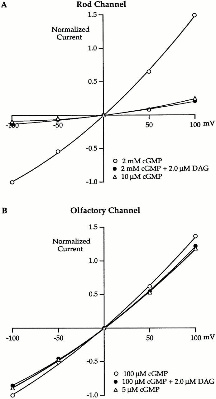 Figure 6. Inhibition by DAG is not voltage-dependent. Addition of DAG mimics a reduction in cGMP concentration, producing increased current–voltage rectification consistent with lower Po. Steady state current–voltage relations constructed from data obtained from single patches; all data in a given plot are from the same patch. Open circles represent cGMP-activated currents at saturating cGMP in the absence of DAG. Closed circles represent currents at saturating cGMP in the presence of 2 μM DAG. For comparison, the triangles show the currents at lower cGMP concentration, without DAG: 10 μM cGMP for rod and 5 μM for olfactory. (A) Rod channels. (B) Olfactory channels. |