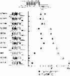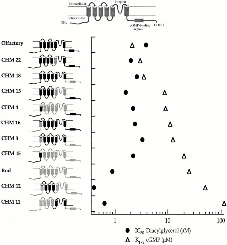 Figure 8. K1/2 (cGMP) and IC50 (DAG) show an approximately inverse relationship among chimeras. In the chimera illustrations, the regions shown in black are from the olfactory channel, and the regions shown in gray are from the rod channel. A general channel diagram showing more detail is included at the top of the figure. The data for chimeras shown in this figure, but not included in Fig. 7, were measured from the following numbers of patches: CHM18 (six); CHM22 (six); CHM16 (five); CHM12 (three); CHM4 (five); and CHM15 (four). Chimeras are arranged from top to bottom in the order of increasing cGMP K1/2 values. Points represent values of cGMP K1/2 (triangles) and DAG IC50 (circles) obtained by fitting Hill curves to averaged data of each type (e.g., as in the cGMP dose–response curves without DAG shown in Fig. 2 and as in the DAG dose–response data at saturating cGMP shown in Fig. 3 and Fig. 7). |