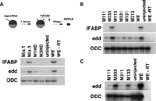 Fig. 2. Animal cap assays of Mix mutants demonstrating that the homeodomain and carboxyl terminus of Mix.3 co-operate to induce endoderm. (A) Schematic diagram of the animal cap assay. Mix mRNA (1 ng) is injected into single cell fertilized embryos and incubated until stage 8. The animal polepresumptive ectoderm is dissected and incubated for five days until sibling stage 36. Total RNA is harvested from the caps, reverse transcribed and endoderm specific genes are PCR amplified. Endoderm genes examined are intestinal fatty acid binding proteins (IFABP), endodermin (edd), and GATA-5. Ornithine decarboxylase (ODC) is a control for RNA recovery. Uninjected caps, whole embryos (WE) and whole embryos minus reverse transcriptase are run in all experiments as controls. Neither Mix.1 nor Mix.3 truncation mutants induce endoderm specific genes in animal cap assays (M1HD, M3HD). (B) Homeodomain and carboxyl termini swap mutants do not induce endoderm genes in animal cap assays (M113, M331, M131 and M313). (C) Homeodomain and carboxyl terminus of Mix.3 are necessary (M133) to induce endoderm genes in animal cap assays.
