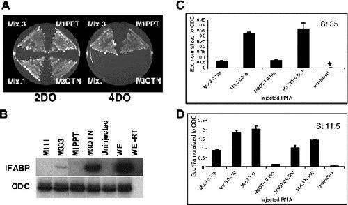 Fig. 5. The Smad2 binding domain (SBD) of Mix.3 is involved in endoderm induction. (A) Yeast two-hybrid analysis of Mix.3 and M1PPT interaction with xSmad2. Mix genes fused to the Gal 4 DNA binding domain were expressed with xSmad2 fused to the Gal4 activation domain in yeast and cultured on two drop out (2DO) and four drop out (4DO) selection agar plates. Growth on the non-selective media (2DO) indicates that all the yeast strains are viable. Only the wild type Mix.3 and the Mix.1 mutant with the added SDB (M1PPT) supported growth on the selective (4DO) media indicating interaction with Xenopus Smad2. (B) Mix.3 with a SBD mutation (M3QTN) and Mix.1 with an added SBD (M1PPT) were assayed for endoderm induction in animal cap assays. One nanogram of RNA was injected and caps were harvested at stage 35. (C) Lower amounts of RNA were injected into embryos (0.5 and 0.1 ng) and caps were harvested at stage 35. Levels of edd normalized to ODC were assayed by real-time PCR. Edd levels were undectable in uninjected cap cDNA (*). (D) A dose response of Mix.3 and M3QTN RNA (0.1, 0.5 and 1 ng) for induction of Sox17α in stage 11.5 animal caps. Sox17α was detected by real-time PCR and normalized to ODC.