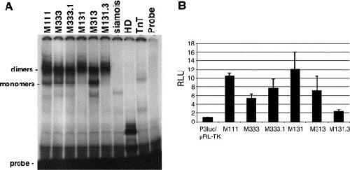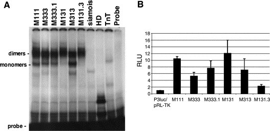 Fig. 8. (A) Electrophorectic mobility gel shift assay of Mix.3 swap mutants demonstrating that all of the mutants retain DNA binding capability. In vitro transcribed and translated proteins shifted the Mix binding site P3 (TAATTGAATTA). HD is the Mix.1 homeodomain and TnT contains rabbit reticulocyte lysate transcription/translation reaction without Mix cDNA. (B) Luciferase transcriptional assay of Mix.3 swap mutants. A Mix.3 responsive promoter, which contained three P3 sites and a minimal promoter (TATA box), driving luciferase gene expression (P3luc) was co-injected with a Renilla luciferase internal control plasmid (pRL-TK) either with or without Mix synthetic mRNA. Pools of embryos were harvested at stage 11 and assayed for luciferase activity. Luciferase activity was normalized to embryos injected with reporter constructs without Mix mRNA. Shown is the combined average of three separate experiments. All of the mutants show some transcriptional activity although high-levels of activity do not correlate with endoderm induction.