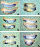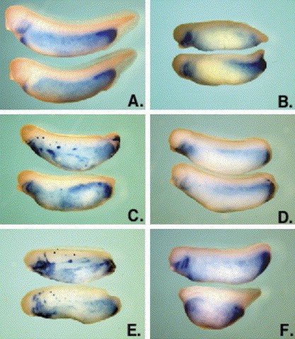 Fig. 10. Mix.3 mutants induce the ectopic expression of endodermin (edd) in whole embryos. Single cell fertilized embryos were injected with Mix RNA (1 ng) and assayed for endodermin expression by in situ hybridization at stage 36. Embryos were injected with M111 (B), M333 (C), M131 (D), M131.3 (E) and M313 (F) or left uninjected (A). Mutants that induce endoderm marker expression in the animal cap assays (M333 and M131.3) also induce ectopic expression of endodermin in the whole embryo (C and E, respectively).