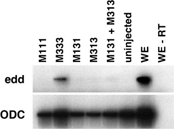 Fig. 3. The homeodomain and carboxyl terminus of Mix.3 must be on the same protein to co-operate. Mutants containing the Mix.3 homeodomain (M131) and the carboxyl terminus (M313) were co-injected into embryos for animal cap assays. The mutants alone or together are unable to induce endodermin indicating that the Mix.3 homeodomain and the Mix.3 C-terminus must be present on the same polypeptide.