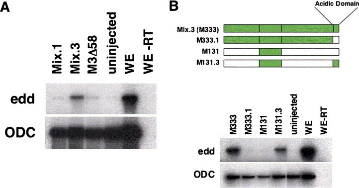 Fig. 6. (A) Animal cap assay demonstrating that truncation of the acidic domain from Mix.3 (M3Δ58) destroys endoderm inducing activity. (B) Schematic diagram of the acidic domain swap mutants. The carboxyl terminal sixty-two amino acids of Mix.3 was swapped onto M131 to generate M131.3 and the carboxyl terminal fifty-nine amino acids of Mix.1 was swapped onto M333 to generate M333.1. Animal cap assays demonstrate that the homeodomain and acidic domain of Mix.3 are sufficient for endoderm induction (M131.3) whereas the acidic domain of Mix.1 is not (M333.1).