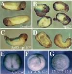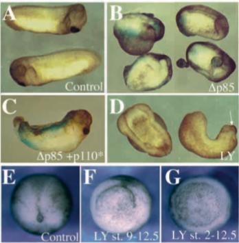 (1 ng/blastomere) by co-injection with activated p110α (p110caax, 1 ng/blastomere). In C, trunk and head but not tail development is rescued. (E-G) Vegetal views at the late gastrula stage (st. 12.5) of a control embryo (E), an embryo incubated in 80μM LY294002 between stages 9 and 12.5 (F) and an embryo incubated in 30 μM LY294002 between the two-cell stage and stage 12.5 (G). Gastrulation in embryos F and G has been severely impaired. This phenotype was fully penetrant. |