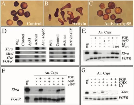 of Xbra. (F) Animal caps from control embryos or from embryos injected with mRNA for âp85 (250 pg/blastomere), p110caax (125 pg- blastomere), or a combination of both, were explanted during the blastula stages and cultured when indicated in 50 ng/ml FGF2 until the early gastrula stage and processed for RT-PCR with Xbra primers. (G) Animal caps were excised at stage 8, treated with FGF2 (50 ng/ml) alone or in combination with LY294002 (100 μM) or cycloheximide (CHX, 10 μg/ml) as indicated, and frozen at stage 10 for RT-PCR analysis of Xbra expression (top panels). In D-G, the ubiquitously expressed FGF receptor 1 gene (FGFR) is used as a loading control. |