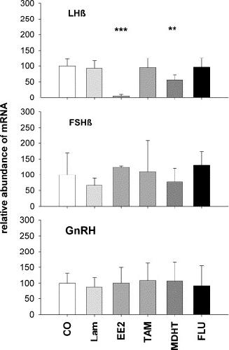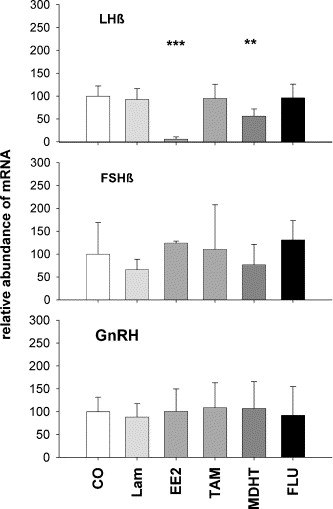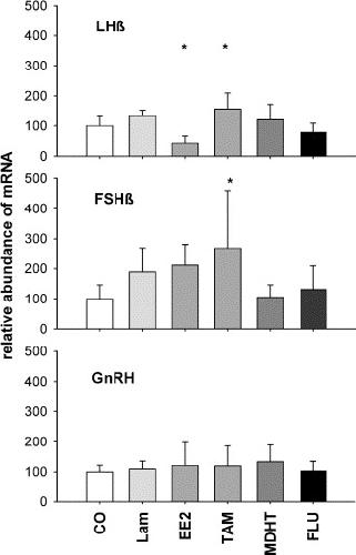 Environmental pollutants can interfere with the endocrine system of a variety of animals and are suggested to contribute to the worldwide decline of amphibians. In this study, the effects of endocrine disrupting compounds (EDC) on the hypothalamus-pituitary-gonad axis, regulating reproduction, were investigated in Xenopus laevis by determining their potential impact on gene expression of gonadotropin releasing hormone (GnRH), luteinizing hormone beta-subunit (LHbeta) and follicle-stimulating hormone beta-subunit (FSHbeta) in brain and pituitary using semi-quantitative reverse transcription polymerase chain reaction (RT-PCR). One environmental sample and four model compounds, ethinylestradiol (EE2), tamoxifen (TAM), methyldihydrotestosterone (MDHT), and flutamide (FLU), corresponding to (anti)estrogenic and (anti)androgenic modes of action were used at 10(-8)M during a four weeks exposure of adults of both sexes. In general, males had a higher LHbeta mRNA level compared to females, while the mRNA expression of FSHbeta and GnRH did not differ between both sexes. EE2 and MDHT treatment decreased LHbeta mRNA expression in the brain of male X. laevis, while only EE2 but not MDHT reduced LHbeta mRNA in females indicating classical negative feed-back mechanisms on hypophyseal gonadotropin expression. TAM increased LHbeta mRNA and FSHbeta mRNA expression in female X. laevis while none of the other treatments showed an effect on FSHbeta mRNA expression. GnRH expression was not changed by any treatment and exposure of X. laevis to Lambro river water had no significant effect on any of the genes examined. It is reported for the first time in amphibians that gonadotropin mRNA expression is differentially regulated by (anti)estrogenic and (anti)androgenic EDC and that gender-specific patterns of gene expression exist.