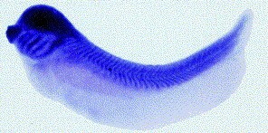 sim2 (single-minded homolog 2) gene expression in Xenopus laevis embryo, assayed via in situ hybridization, NF stage 20, lateral view, anteriorleft, dorsal up.
