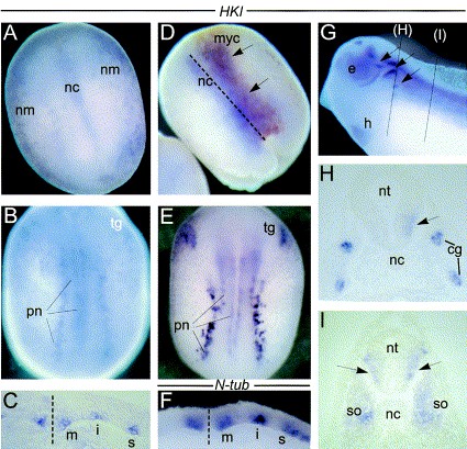 Fig. 2. Normal and Gli2-induced HKI expression. In situ hybridizations with an HKI probe (AâD,GâI) and a neural-specific N-Tubulin (N-tub) probe (E,F) were performed on stage Ë12.5 (A,D), Ë15 (B,C,E,F) and Ë28 (GâI) embryos. (AâC,EâI) are uninjected embryos and (D) was injected with Gli2 RNA into one blastomere at the two-cell stage, resulting in unilateral expression of myc-tagged Gli2 protein (brown staining labeled âmycâ). (A,B,D,E) anterior is to the top or top-left and the dorsal side is facing up. (G) anterior is to the left and the dorsal side is to the top. (C,F,H,I) Cross-sections of embryos; the dorsal side is to the top. Abbreviations: cg, cranial ganglia; e, eye; h, heart; i, interneurons; nc, notochord; nm, cells that may be neuromasts; nt, neural tube; m, motorneurons; s, sensory neurons; so, somites; tg, trigeminal ganglia. Dashed lines indicate the axes of symmetry. Solid black lines and letters in parenthesis next to them in (G) indicate the approximate level corresponding to the sections shown in panels (H,I). Arrows in (D) point to ectopic expression of HKI (blue), in (G) arrows point to cranial ganglia, and in (H,I) arrows point to ventral neurons, possibly motorneurons.