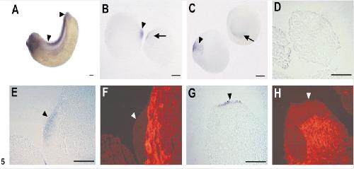 is present in the ectoderm (G, arrowhead) and not in the RLDX-labeled mesoderm (H, arrowhead). Scale bar, 150 mm.