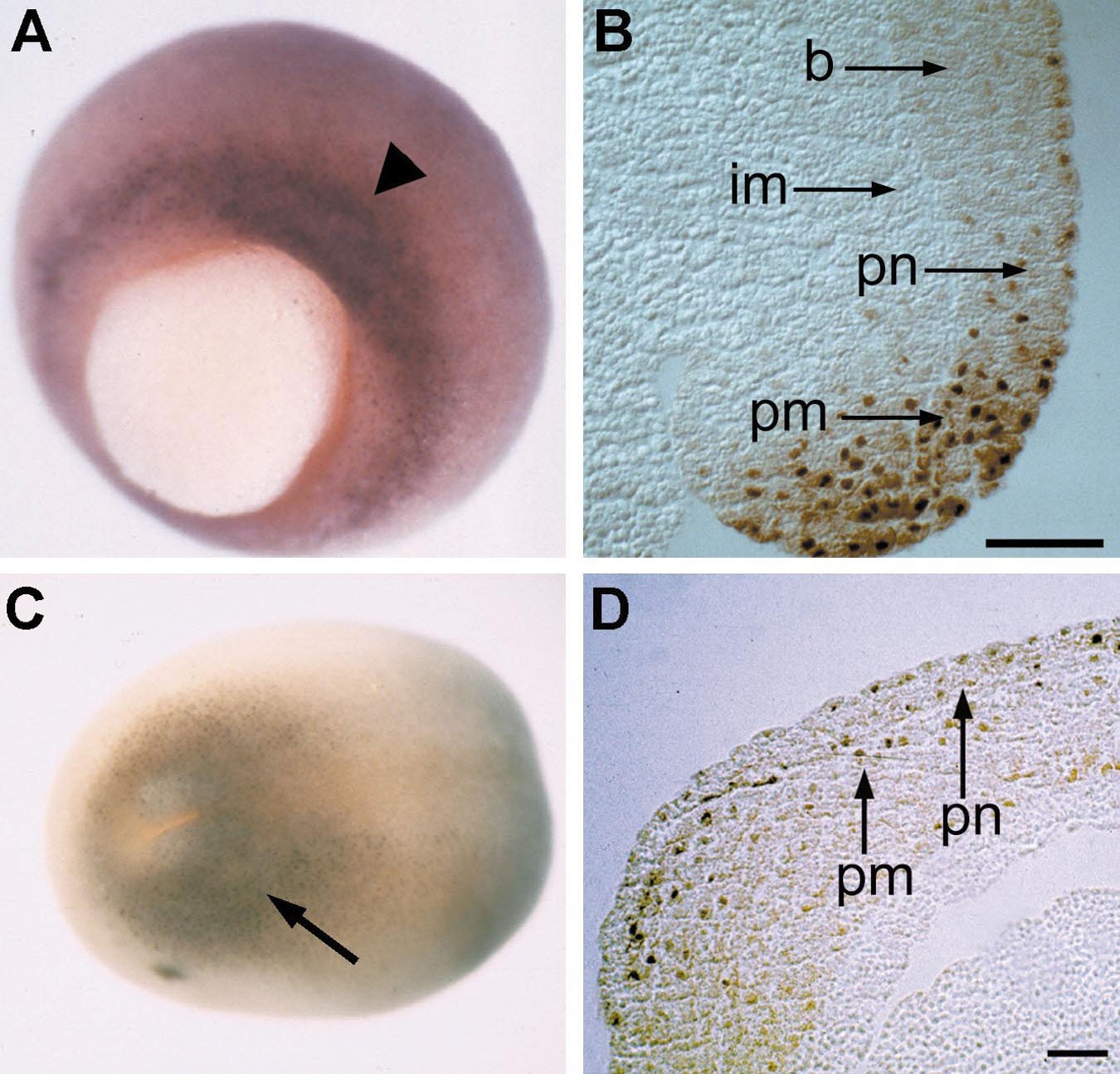 involuted mesoderm (im) and is not present in the anterior neural tissue (b, brain). During neurula stages (posterior staining of stage 17