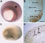 arrowhead indicates dorsal). (B) A sagittal section of staining in a late gastrulaembryo (dorsal is on the right and the animal pole is up).