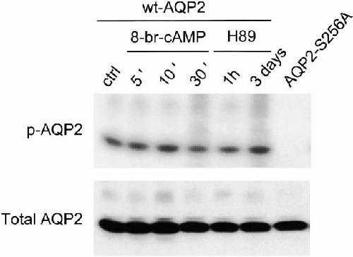 Figure 1. Phosphorylation of AQP2 in oocytes. Oocytes, injected with wt-AQP2 or AQP2-S256A cRNA, were labeled with [32P]orthophosphate for 2 d. Subsequently, oocytes were not stimulated (ctrl, AQP2-S256A), or were incubated with 5 × 10−4 M 8-Br-cAMP or 10−4 M H89 for the indicated time periods. Total membranes were isolated and divided into two portions. One portion was solubilized, AQP2 was immunoprecipitated and subjected to PAGE, the gel was dried, and labeled AQP2 (p-AQP2) was visualized using autoradiography. The other portion was directly immunoblotted for AQP2 (Total AQP2).