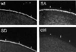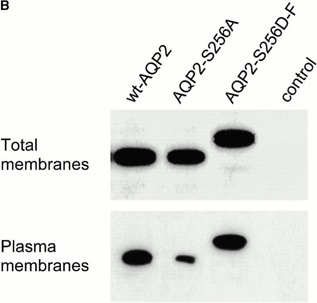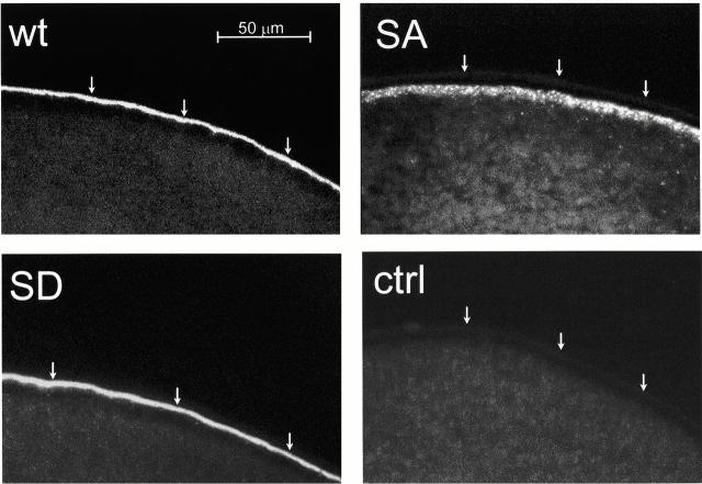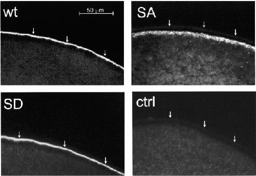 Figure 3. Immunocytochemistry of oocytes expressing wild-type or mutant AQP2 proteins. 2 d after injection, oocytes injected with cRNA encoding wt-AQP2 (wt), AQP2-S256A (SA), or AQP2-S256D-F (SD), and noninjected oocytes (ctrl) were fixed and embedded in paraffin. In 5-μm sections, AQP2 was visualized using rabbit AQP2 antibodies followed by Alexa-594–conjugated anti–rabbit IgG. Arrows indicate the plasma membrane.