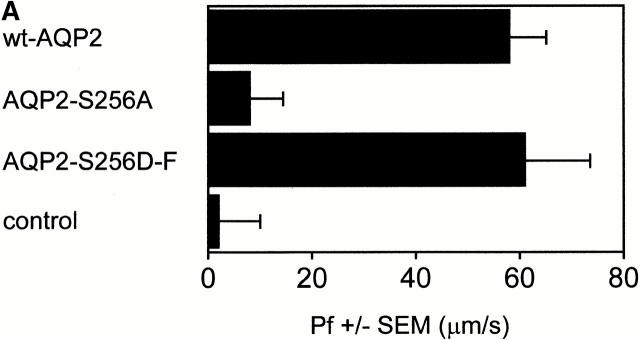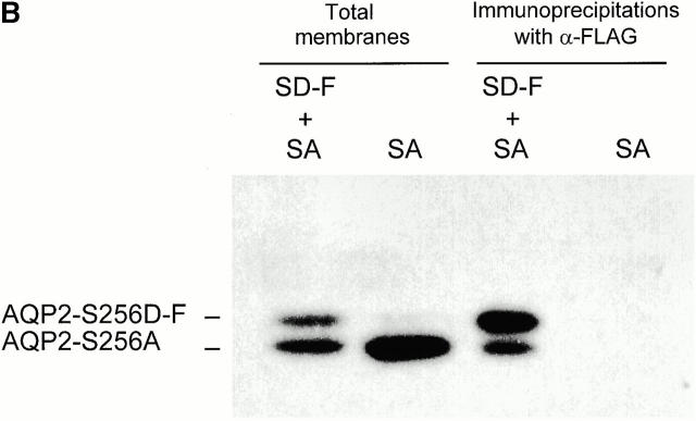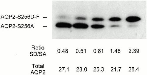Figure 5. Semiquantification of the amounts and ratios of AQP2-S256A and AQP2-S256D-F in coinjections. Copy RNAs encoding AQP2-S256D-F and AQP2-S256A were mixed in the ratios 1:3, 1:2, 1:1, 2:1, and 3:1 (from left to right) and a total of 0. 4 ng was injected into oocytes. 2 d later, the Pf values were determined (see Table ) and total membranes were isolated and immunoblotted for AQP2. The individual signals of AQP2-S256A (SA) and AQP2-S256D-F (SD) were scanned and the amounts of expressed protein were semiquantified (in arbitrary units) using the scanned signals of a twofold dilution series of wt-AQP2 as a standard. From these data, the SD/SA ratio and total AQP2 amounts were calculated.