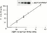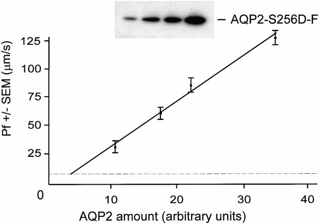 Figure 6. The relation between the expressed amounts and conferred water permeabilities of AQP2-S256D-F. Of oocytes, injected with 0.1, 0.2, 0.3, or 0.4 ng of AQP2-S256D-F cRNA, the water permeability (Pf ± SEM in μm/s) was measured. Total membranes were isolated and immunoblotted for AQP2 (AQP2-S256D-F; insert). The signals were scanned and the amounts of expressed AQP2-S256D-F (AQP2 amount in arbitrary units) were semiquantified as described in the legend to Fig. 5. The linear relation between the amount of AQP2-S256D-F protein and the conferred water permeability was: Pf = (3.97 × amount of AQP2 protein expected in membrane) − 9. 7. For expression levels lower than obtained for 0.1 ng AQP2-S256D-F cRNA, the relation was extrapolated to the Pf level of control oocytes (8 ± 4 μm/s, dotted line).