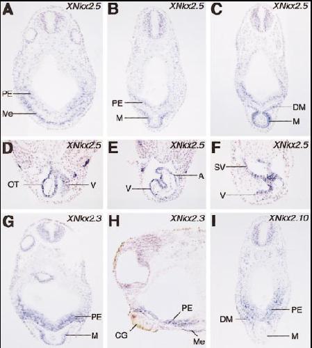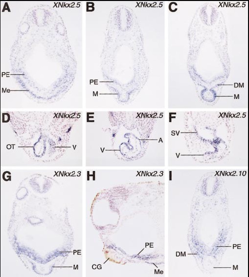 atrium; SV, sinus venosus; PE, pharyngeal endoderm; M, myocardium; DM, dorsal mesocardium; CG, cement gland; Me, mesoderm.