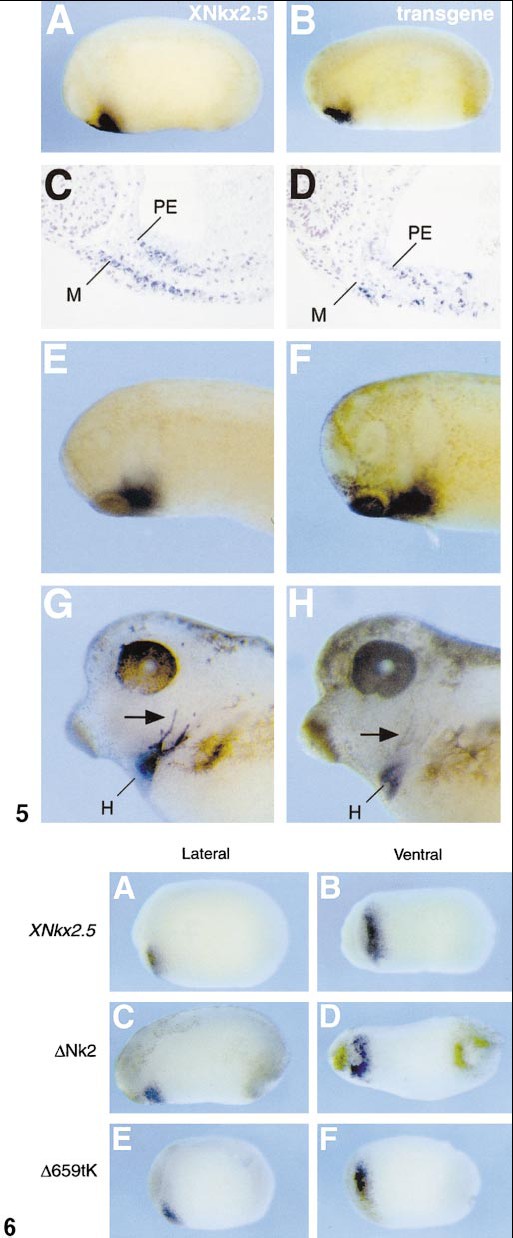 respectively. Each pair of images shows lateral and ventral views of the same embryo. (A, B) Endogenous XNkx2-5 expression. (C, D) DNk2 transgene. (E, F) D659tK transgene. In all cases anterior is to