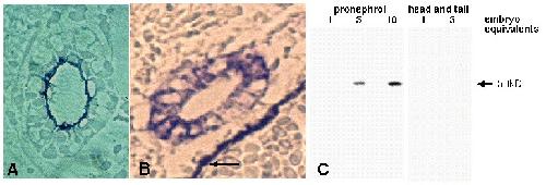 | Description | adult mesonephric kidney tissue was primary immunogen, then microdissected stage 47 tadpole pronephric kidneys used for boosts |