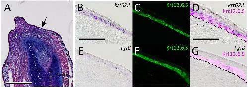 Reactivation of larval keratin gene (krt62.L) in blastema epithelium during Xenopus froglet limb regeneration., Dev Biol 2017 |