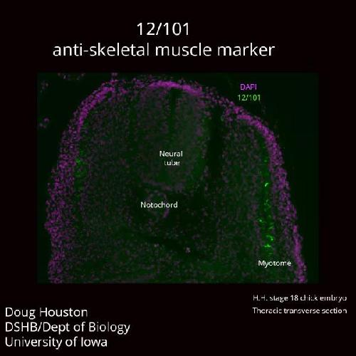 | Description: | 12/101 is a differentiated skeletal muscle marker, fast & intermediate fibers, and is somite-specific in embryos. Deposited by J.P. Brockes. Cite this (DSHB Cat# 12/101, RRID:AB_531892). Myeloma strain: NS-1/SP2/0 |