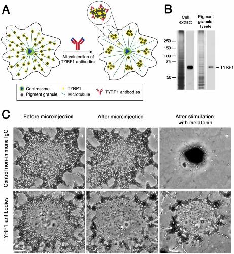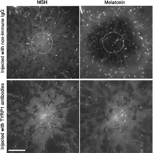 | Description: | TYRP1 antibodies were produced in the Rodionov Lab (Univ. Connecticut) by immunizing rabbits with a synthetic peptide that corresponded to the C-terminal amino acid sequence of the Xenopus laevis TYRP1 (see Rezaul et al., 2016). Antibodies against TYRP1 link neighboring pigment granules to each other, inducing formation of pigment granule clusters unable to efficiently move along MTs because of their large size. |