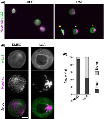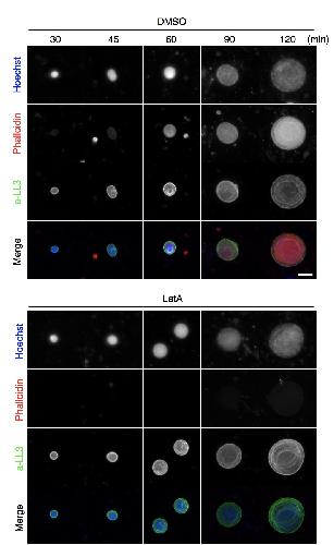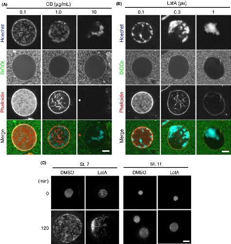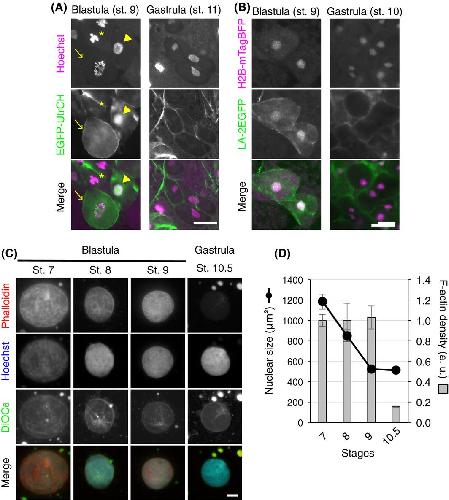 Chromatin tethering to the nuclear envelope by nuclear actin filaments: a novel role of the actin cytoskeleton in the Xenopus blastula., Genes Cells 2017 |
