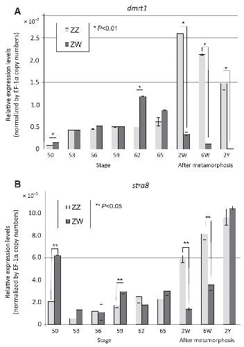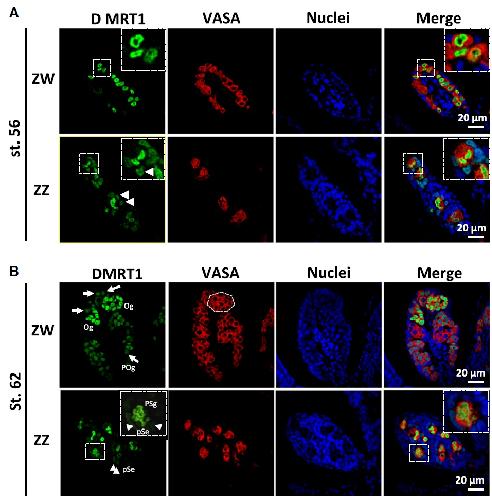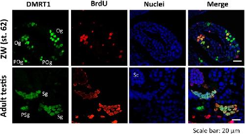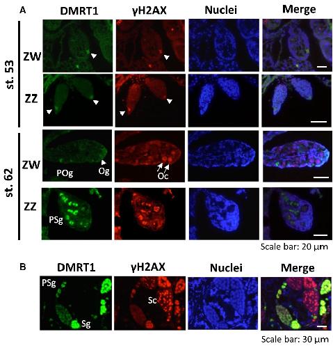 Sexually dimorphic expression of Dmrt1 and γH2AX in germ stem cells during gonadal development in Xenopus laevis., FEBS Open Bio 2016 |