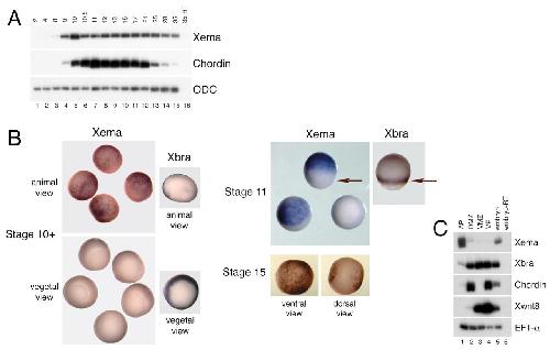 Xema, a foxi-class gene expressed in the gastrula stage Xenopus ectoderm, is required for the suppression of mesendoderm., Development 2005 |