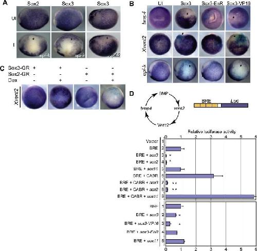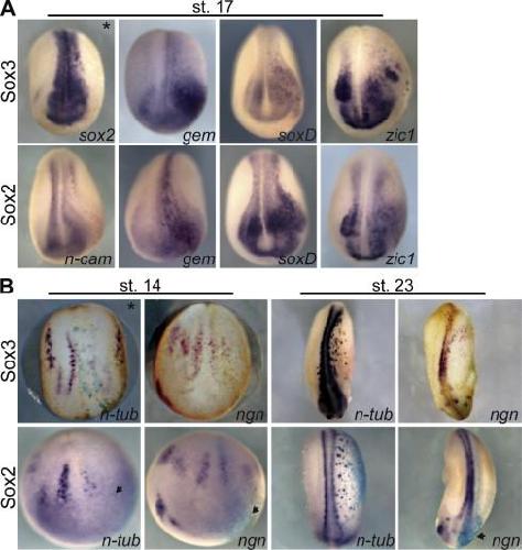 Xenopus Sox3 activates sox2 and geminin and indirectly represses Xvent2 expression to induce neural progenitor formation at the expense of non-neural ectodermal derivatives., Mech Dev 2009 |