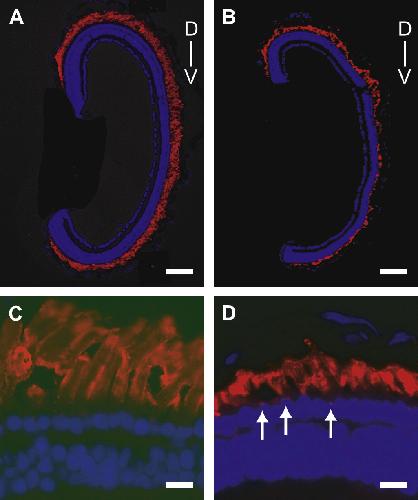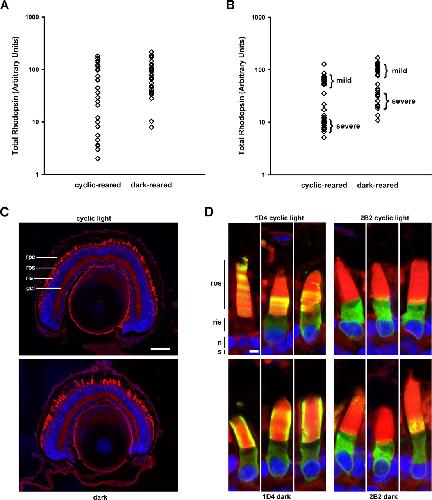 Xenopus laevis P23H rhodopsin transgene causes rod photoreceptor degeneration that is more severe in the ventral retina and is modulated by light.,