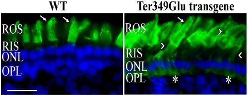 The severe autosomal dominant retinitis pigmentosa rhodopsin mutant Ter349Glu mislocalizes and induces rapid rod cell death.,