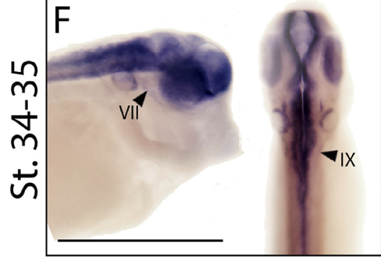 Larger Image ttyh1 (tweety family member 1) gene expression in Xenopus laevis embryo, assayed via in situ hybridization, NF stage 34-35, lateral view, anterior right, dorsal up, (left) , and dorsal view (right). This image is extracted from figure published in: Halleran AD et al. (2015), Image published in: Halleran AD et al. (2015) Copyright © 2015. Image reproduced with permission of the Publisher, Elsevier B. V.