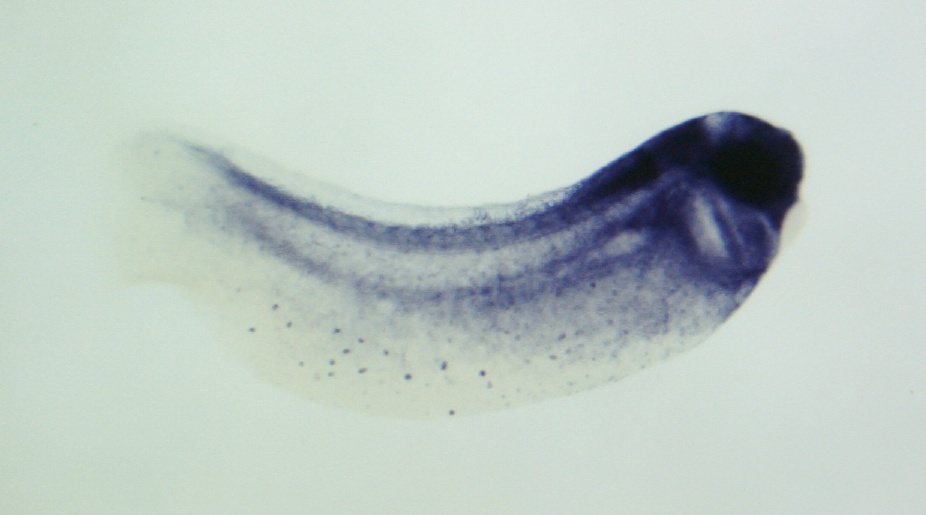 Larger Image lsp1 (lymphocyte-specific protein 1) gene expression in Xenopus laevis embryo, assayed via in situ hybridization, NF stage 28, lateral view, anterior right, dorsal up. Copyright © Patient Lab Image created by: Aldo Ciau-Uitz