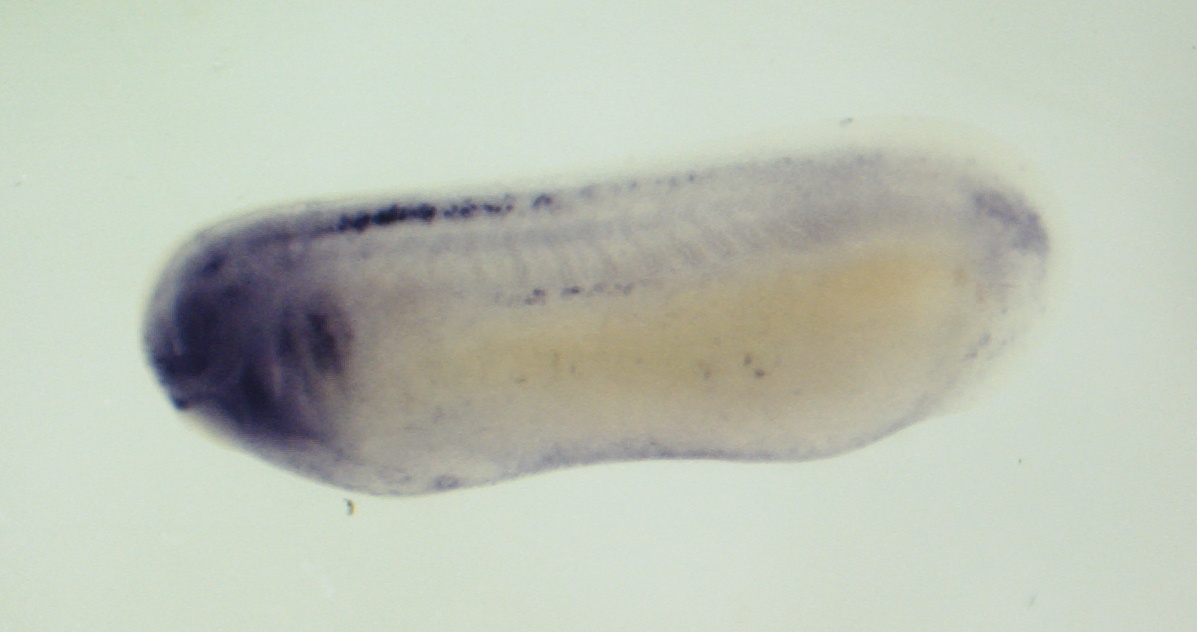 Larger Image egr1 (early growth response 1) gene expression in Xenopus laevis embryo, assayed via in situ hybridization, NF stage 24, lateral view, anterior left, dorsal up. Copyright © Patient Lab Image created by: Aldo Ciau-Uitz
