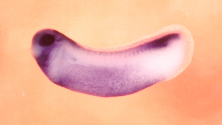 Larger Image etv4 (ETS variant transcription factor 4) gene expression in Xenopus laevis embryo, assayed via in situ hybridization, NF stage 28, lateral view, anterior left, dorsal up. Copyright © Patient Lab Image created by: Aldo Ciau-Uitz