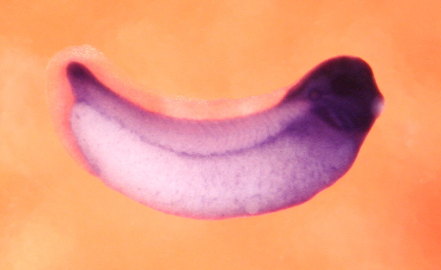 Larger Image etv3 (ETS variant transcription factor 3) gene expression in Xenopus laevis embryo, assayed via in situ hybridization, NF stage 31, lateral view, anterior right, dorsal up. Copyright © Patient Lab Image created by: Aldo Ciau-Uitz