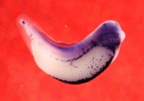 lmo2 (LIM domain only 2 (rhombotin-like 1)) gene expression in Xenopus laevis embryo, assayed via in situ hybridization, NF stage 35 & 36, lateral view, anterior right, dorsal up.