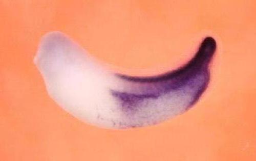 Larger Image hoxa10 (homeobox A10) gene expression in Xenopus laevis embryo, assayed via in situ hybridization, NF stage 33 & 34, lateral view, anterior left, dorsal up. Copyright © Patient Lab Image created by: Aldo Ciau-Uitz