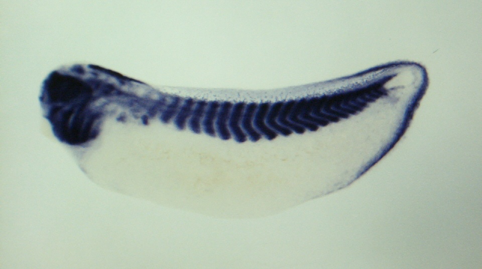 Larger Image hey1 (hes-related family bHLH transcription factor with YRPW motif 1) gene expression in Xenopus laevis embryo, assayed via in situ hybridization, NF stage 34, lateral view, anterior left, dorsal up. Copyright © Patient Lab Image created by: Aldo Ciau-Uitz