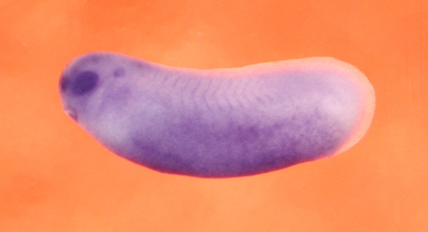 Larger Image mcl1 (myeloid cell leukemia 1) gene expression in Xenopus laevis embryo, assayed via in situ hybridization, NF stage 26, lateral view, anterior left, dorsal up. Copyright © Patient Lab Image created by: Aldo Ciau-Uitz