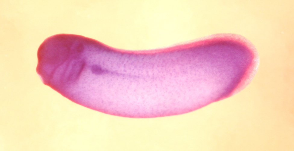 Larger Image ptprf (protein tyrosine phosphatase receptor type, F) gene expression in Xenopus laevis embryo, assayed via in situ hybridization, NF stage 28, anterior left, dorsal up. Copyright © Patient Lab Image created by: Aldo Ciau-Uitz