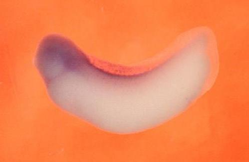 Larger Image lyz (lysozyme) gene expression in Xenopus laevis embryo, assayed via in situ hybridization, NF stage 29 and 30, lateral view, anterior left, dorsal up. Copyright © Patient Lab Image created by: Aldo Ciau-Uitz