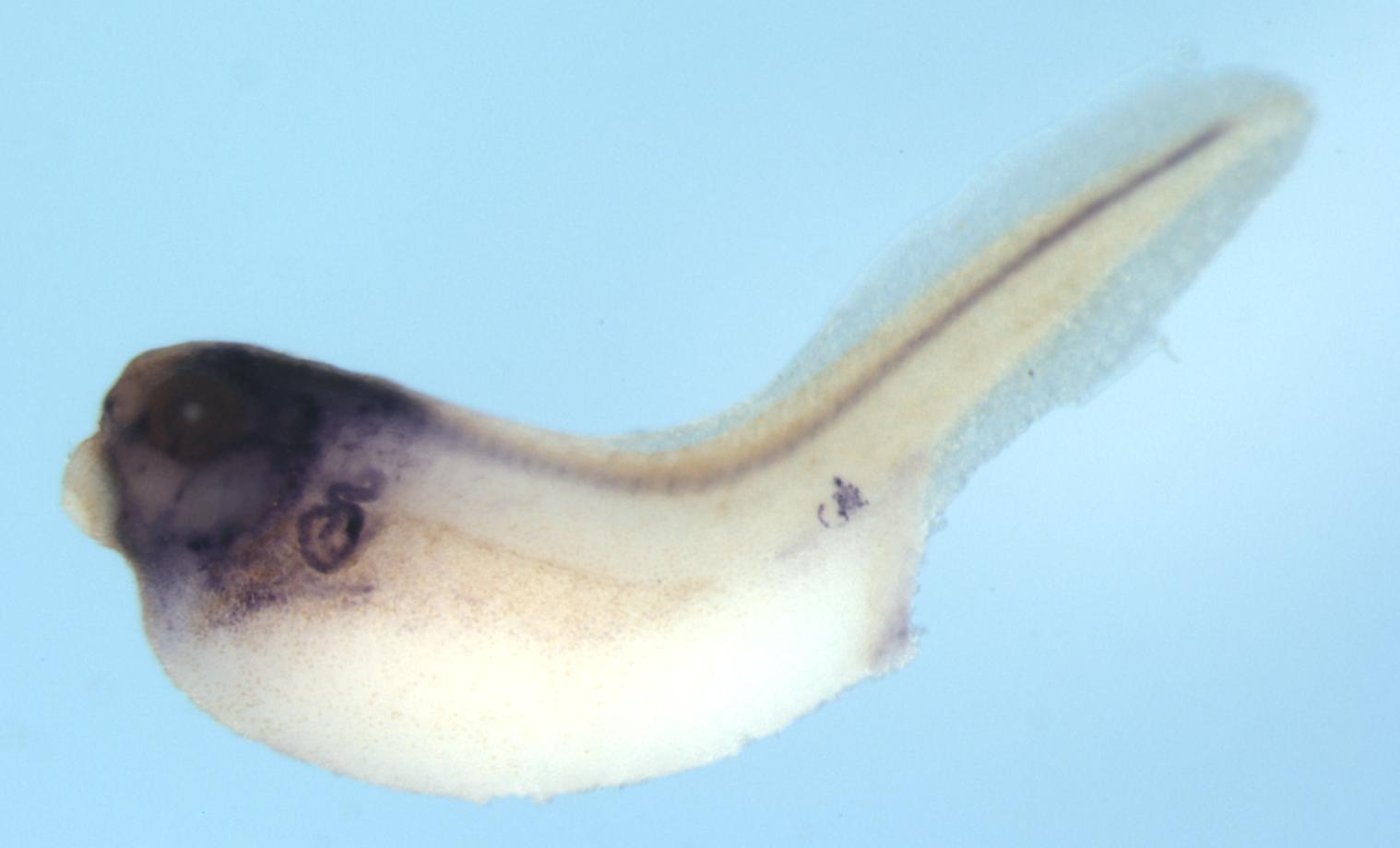 Larger Image irx3 (iroquois homeobox 3) gene expression in Xenopus laevis embryo, assayed via in situ hybridization, NF stage 37 & 38, lateral view, anterior left, dorsal up. Copyright © Soeren S Lienkamp Image created by: Soeren S Lienkamp
