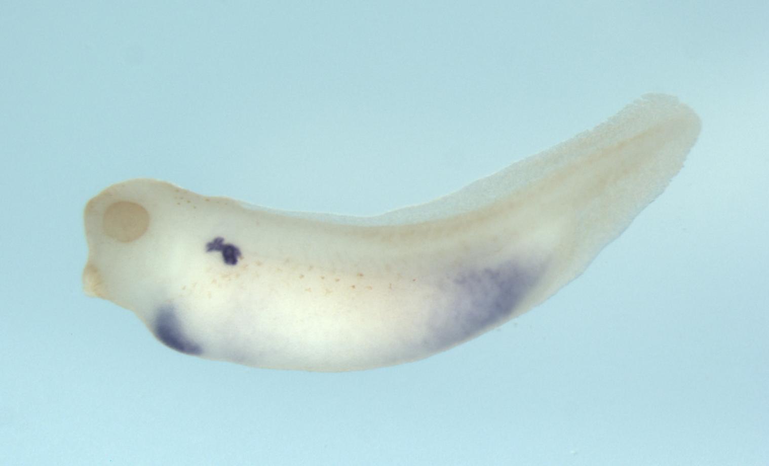 Larger Image hnf4a (hepatocyte nuclear factor 4 alpha) gene expression in Xenopus laevis embryo, assayed via in situ hybridization, NF stage 37 & 38, lateral view, anterior left, dorsal up. Copyright © Soeren S Lienkamp Image created by: Soeren S Lienkamp