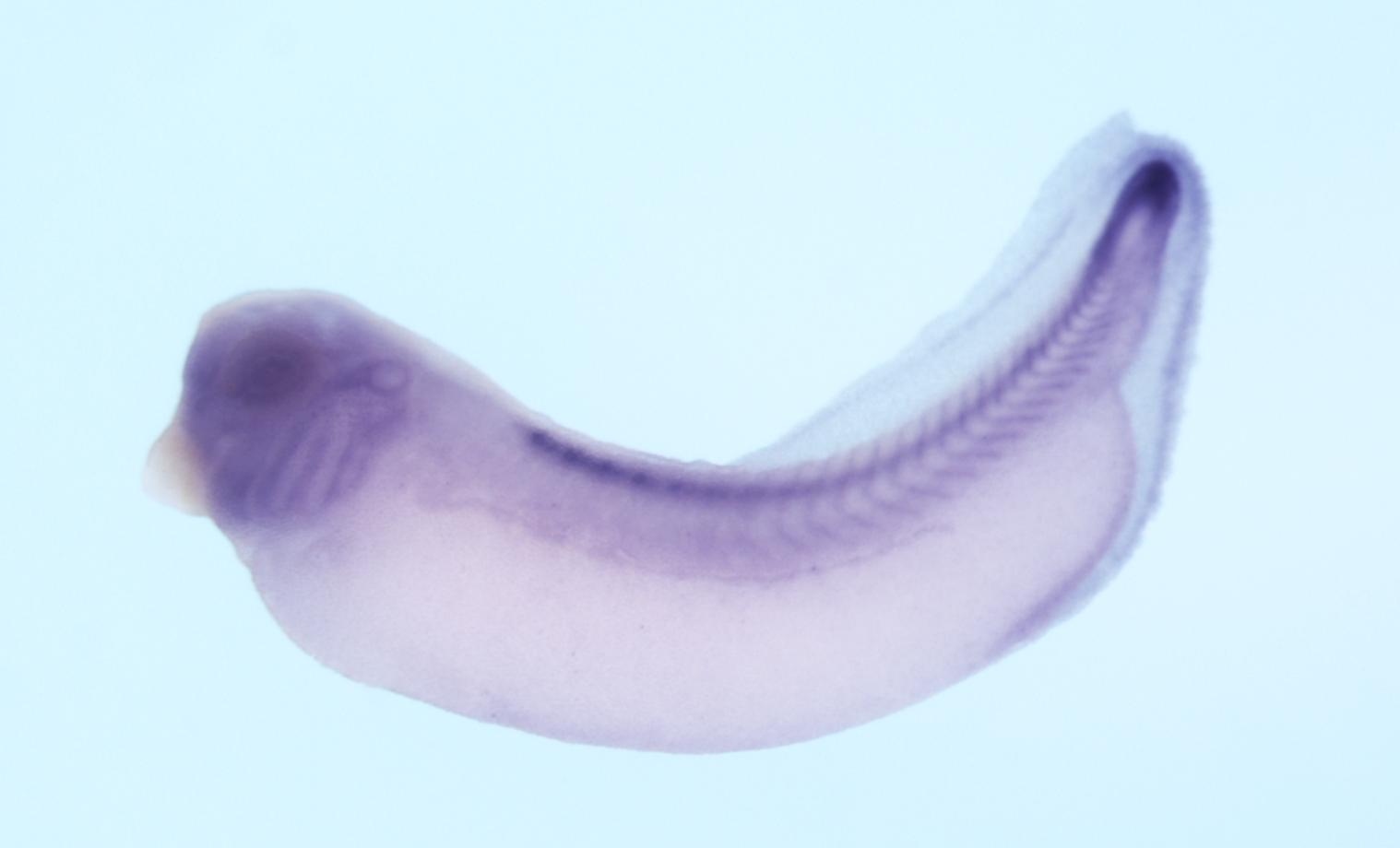Larger Image hoxa7 (homeobox A7) gene expression in Xenopus laevis embryo, assayed via in situ hybridization, NF stage 33 & 34, lateral view, anterior left, dorsal up. Copyright © Soeren S Lienkamp Image created by: Soeren S Lienkamp
